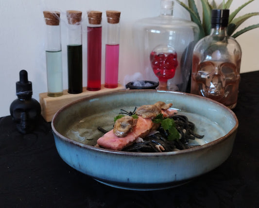 Ingredientes: Linguini, salmão, cogumelos, bacon, toucinho fumado, natas, cebola, alho, salsa, beterraba, sal e pimenta....