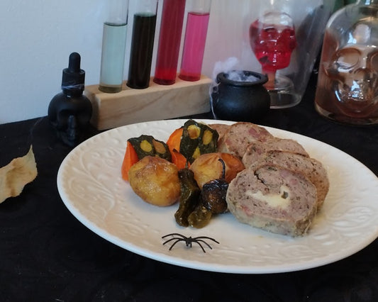 Ingredientes: Carne de vaca, batata, cenoura, curgete, pimentos padron, toucinho fumado, mozarela, tâmaras, pistachio, salsa, alecrim,...