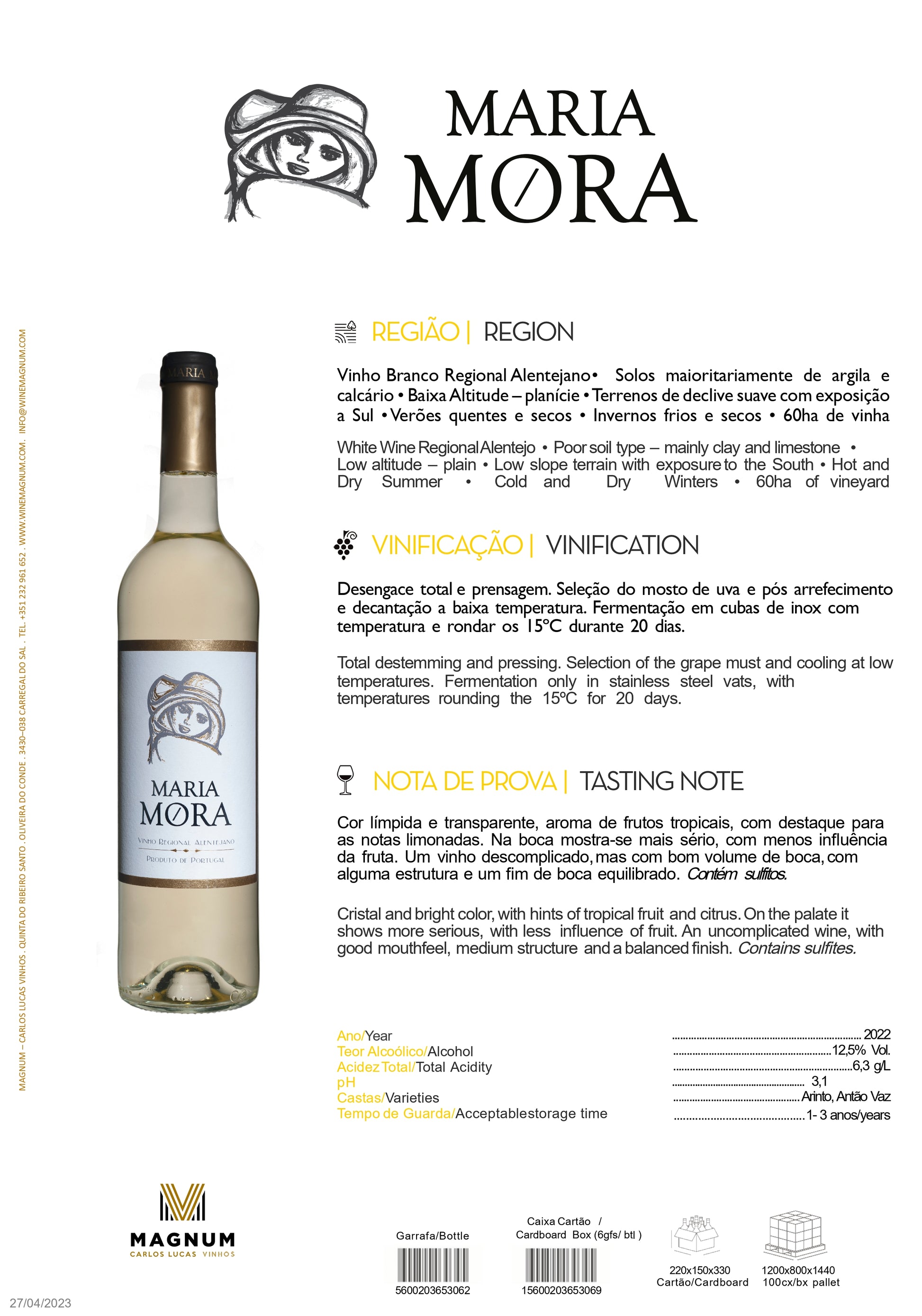 Vinificação: Desengace total e prensagem. Seleção do mosto de uva e pós arrefecimento e decantação a baixa temperatura. Fermentação em cubas de inox com temperatura e rondar os 15oC durante 20 dias.