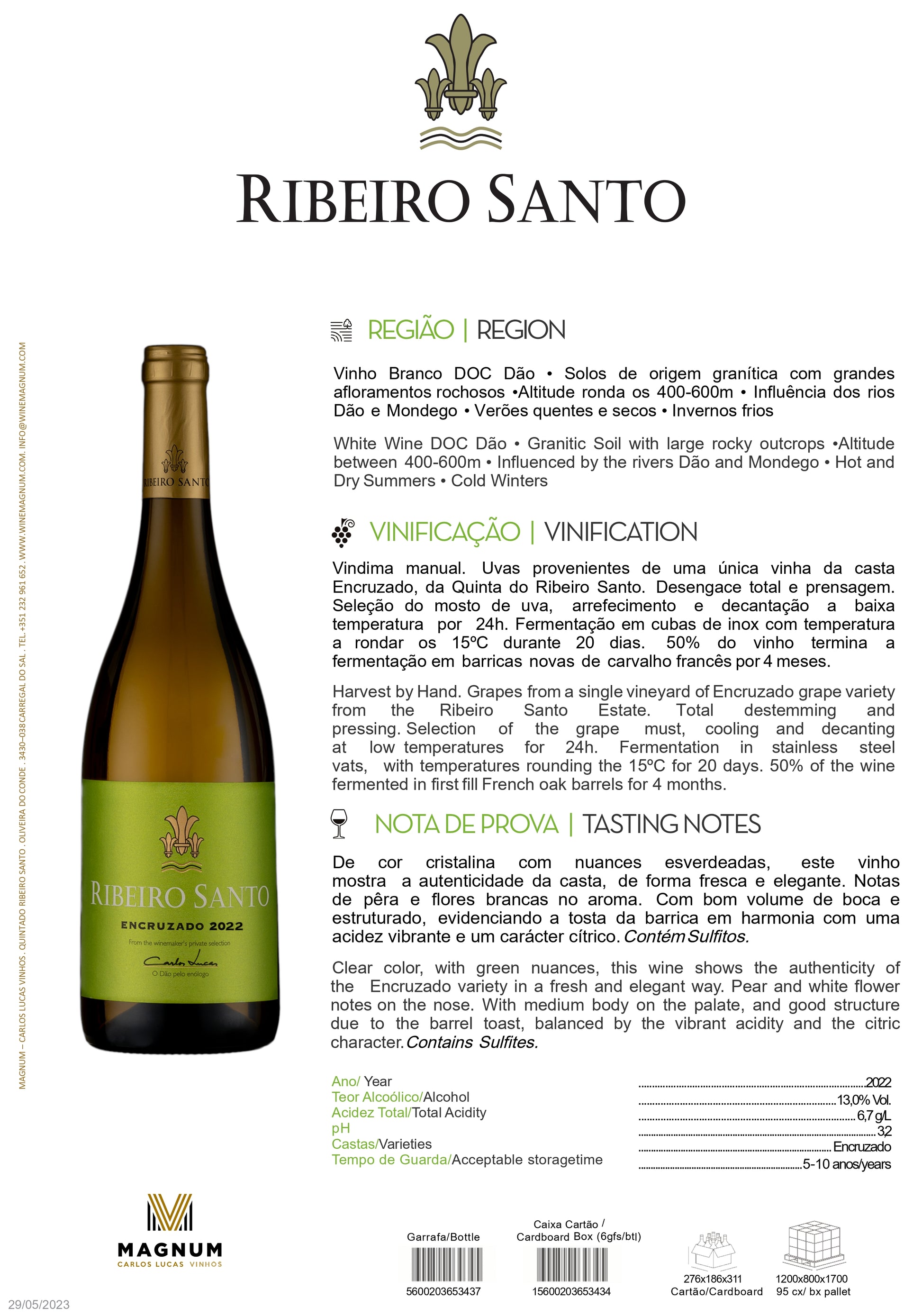 Vinificação: Vindima manual. Uvas provenientes de uma única vinha da casta Encruzado, da Quinta do Ribeiro Santo. Desengace total e prensagem. Seleção do mosto de uva, arrefecimento e decantação a baixa temperatura por 24h. Fermentação em cubas de inox com temperatura a rondar os 15oC durante 20 dias. 50% do vinho termina a fermentação em barricas novas de carvalho francês por 4 meses.